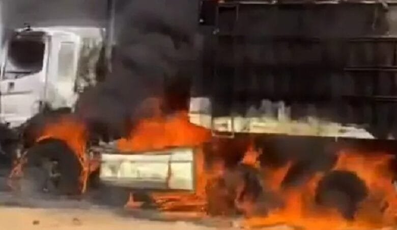 وتداول منصات التواصل الاجتماعي مقاطع فيديو تُظهر احتراق عدد من الشاحنات وتصاعد ألسنة الدخان.