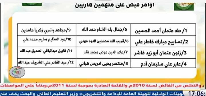 الجدير بالذكر بان من ضمن المطلوبين “جمال بله الشاو حمد الله و مجاهد بشري زكريا حامدين، عبد العظيم سليم محمد علي، قريب الله محمدين الدود مهدي، قابيل عبد الباقي الصديق عبد الله، زنون عثمان أبو زيد فاشر، علاء الدين عوض محمد نقد، عابر على سليمان آدم، منتصر يحيى ادريس هباني وعبد القادر علي الشريف عبد الله