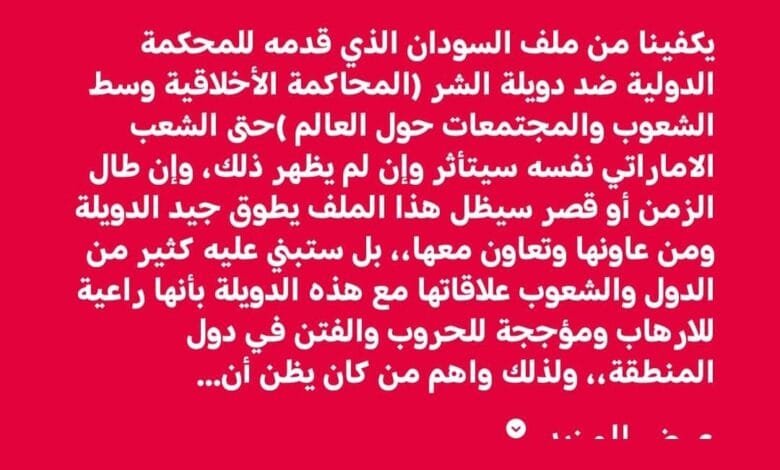 يكفينا من ملف السودان الذي قدمه للمحكمة الدولية ضد دويلة الشر (المحاكمة الأخلاقية وسط الشعوب والمجتمعات حول العالم )حتى الشعب الاماراتي نفسه سيتأثر وإن لم يظهر ذلك، وإن طال الزمن أو قصر سيظل هذا الملف يطوق جيد الدويلة ومن عاونها وتعاون معها،، بل ستبني عليه كثير من الدول والشعوب علاقاتها مع هذه الدويلة بأنها راعية للارهاب ومؤججة للحروب والفتن في دول المنطقة،، ولذلك واهم من كان يظن أن الحكومة السودانية فعلت ذلك لأجل أن يصدر حكم فوري ضد دويلة الشر..