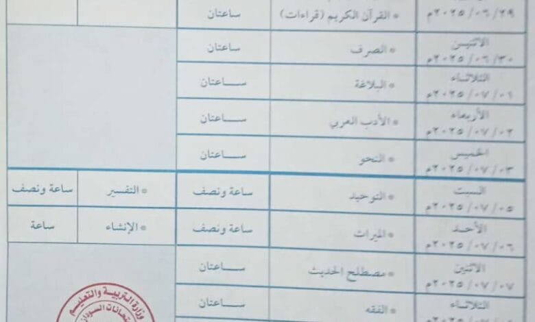 وقال د. معتصم علي الشيخ مدير الادارة العامة لامتحانات السودان ان الادارة اصدرت جداول الامتحانات للشهادات ( الاكاديمية ،الفنية،الاهلية وشهادة التعليم الحرفي) ، مشيرا الى ان الامتحانات ستبدأ يوم الاحد الموافق 29/ 6 /2025م بمادتي التربية الاسلامية والتربية المسيحية ، وتنتهي في يوم الخميس 10/ 7/ 2025م بمادة اللغة الانجليزية مبينا ان الامتحان يبدأ في تمام الساعة الثانية بعد الظهر بتوقيت السودان في جميع المراكز داخل السودان وخارجه .