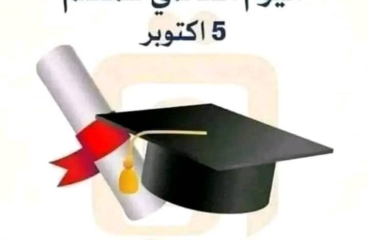 _ يحتفل العالم سنويآ يوم الخامس من إكتوبر كل عام باليوم العالمي للمعلم (عيد المعلم) وهي مناسبة سنوية تحتفل بها الأمم المتحدة، وبمناسبة هذه الإحتفائية للمعلمين رسل السلام وصناع الإبداع نتقدم إليهم بأحر التهاني والتبريكات وأطيب الأماني من سؤيدا الضمير ومكنون الفؤاد إلى الأساتذة الأجلاء ورثة الأنبياء وأحفاد الرابطة القلمية من الجنسين (آدم _ وحواء).